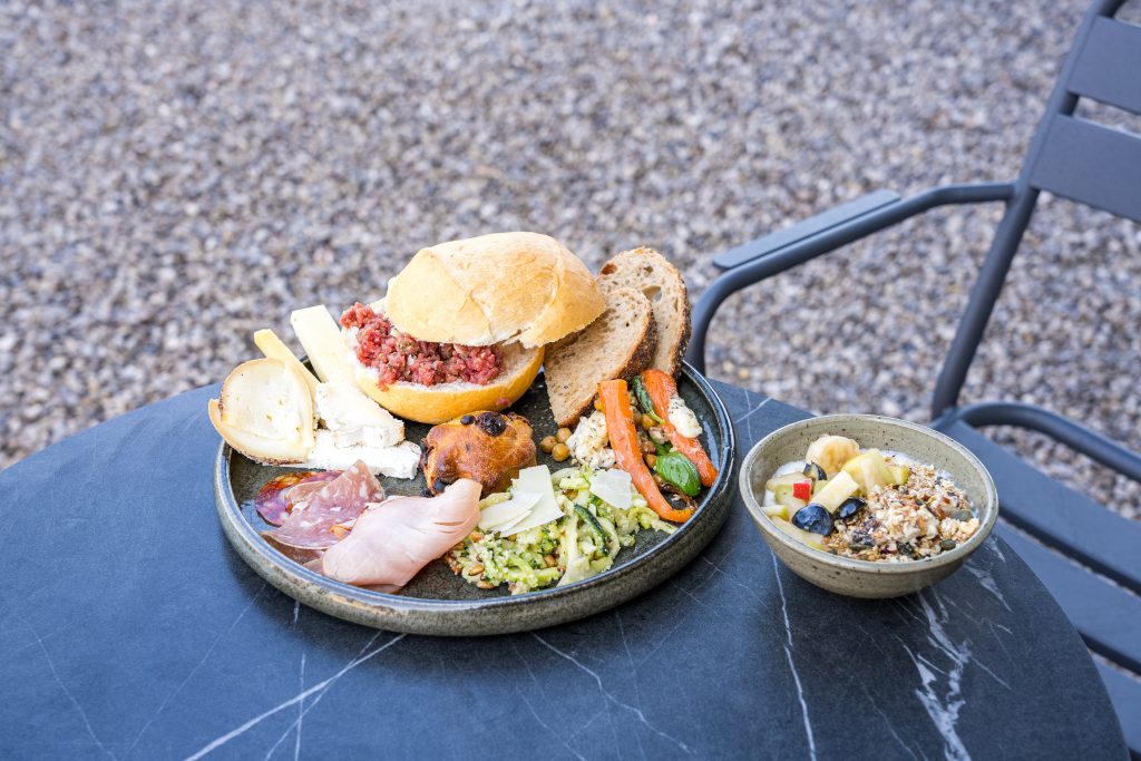 Vers fruitsap, warme drank, uitgebreid assortiment kaas, charcuterie, croissants, brood, pistolets, yoghurt, granola, fruit, seizoensgebonden slaatjes, warm gerechtje uit de keuken en taart als afsluiter.